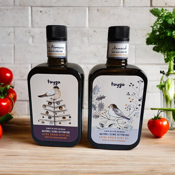 - İki adet 500 ml soğuk sıkım sızma zeytinyağı. 2025-26 hasat yılına ait, yeşil ve alaca dönemden, kaba filtreli, bir şişe Memecik, çeşidi, bir şişe Memecik-Domat blendi.