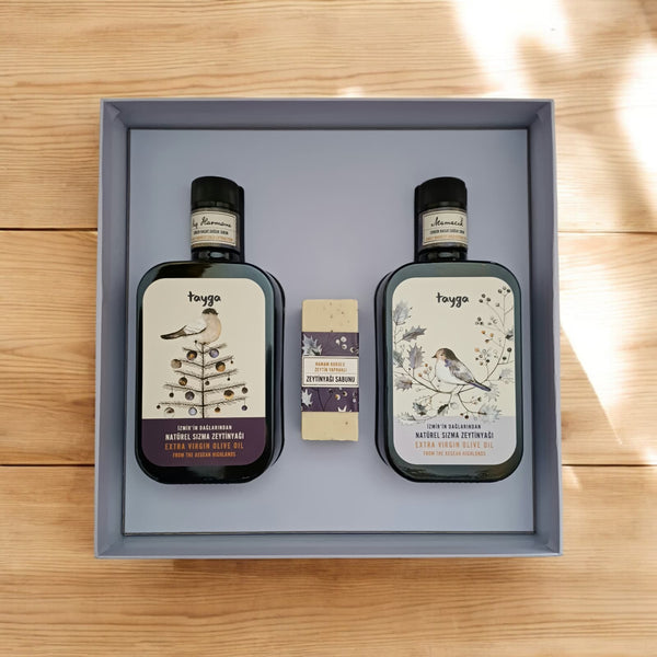 Tayga'nın doğasından esinlenen özel tasarımlı, saklanıp kullanılacak sağlamlıktaki şık kutusu içerisinde, güvenli kapaklı İtalyan şişelerde iki şişe zeytinyağ ve bir sabun.